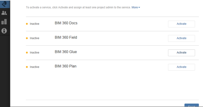 - For BIM 360 Glue, click Activate. Then add a project admin who will invite members to the project.