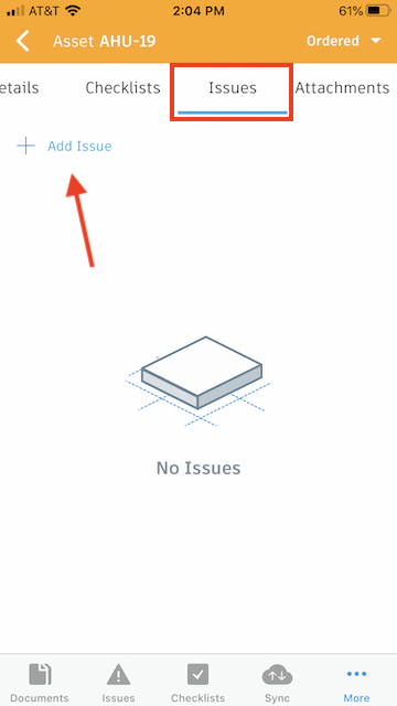 Select an asset from the asset list screen and tap "Add Issue." This will allow you to create an issue associated with the asset. For more information about creating issues on iOS, see Issues (iOS).