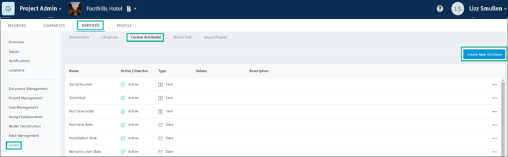 Create and modify custom attributes and status sets in the "Assets" section of the Project Admin module.