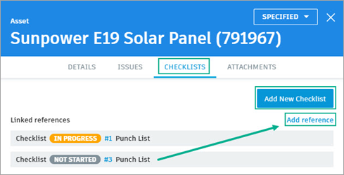 Begin by selecting an asset. From the asset detail list, click "Checklists." From here, you can link to an existing checklist by clicking "Add reference."