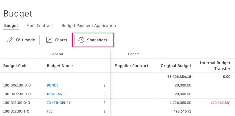 Note: To create and access budget snapshots, you need to be a Project Administrator or have Budget Full Control permissions. These permissions are managed by Project Administrators within the Cost Management Settings.