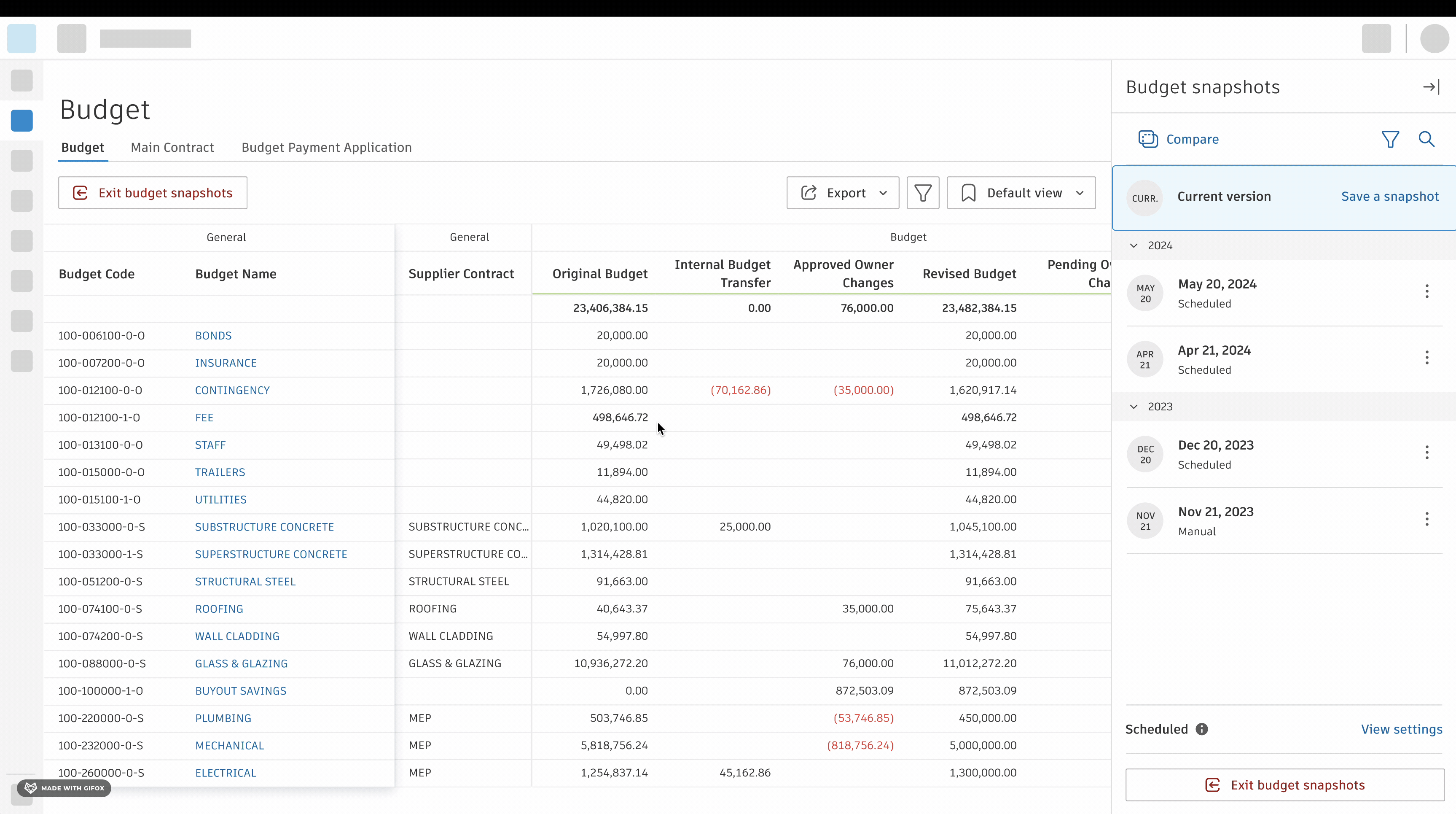 Budget Snapshots allow Cost Management members to capture a snapshot of the project budget at specific points in time. This enables members to compare different versions of the budget to understand how it has changed and why.