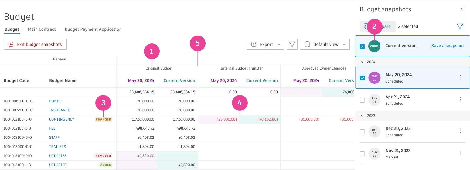 Differences between budget snapshot versions are highlighted with color-coded visual cues, making it easy to see what has changed, been removed, or added.