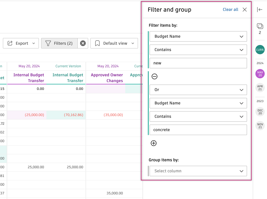 Note: In budget snapshots, filters first process the current version and then display the filtered budgets from the selected snapshots. Budgets that do not meet the filter criteria in the current version but do in the snapshots will not be displayed.