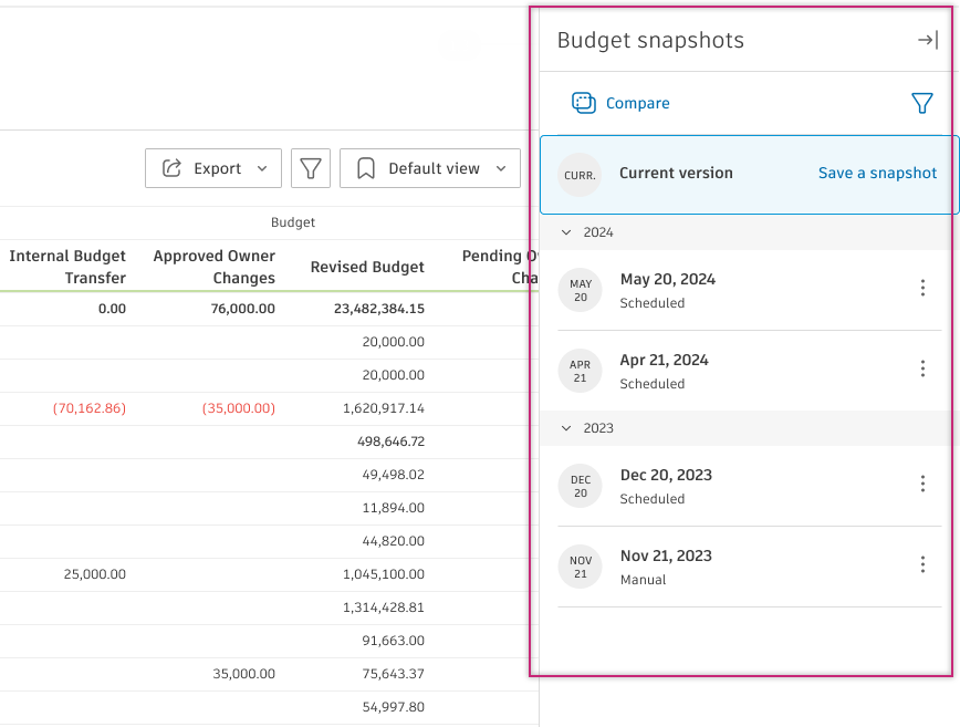 Tip: Filters and saved views function the same in the Snapshots view as in a normal budget overview.
