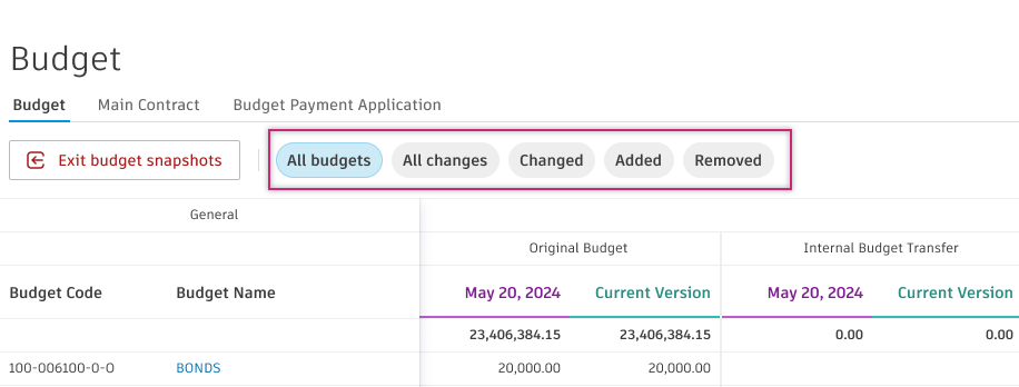 • All Changes: Displays all budgets with statuses of Changed, Removed, or Added.