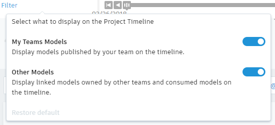 By default, the timeline shows a combination of packages and models from your team as well as those shared by other teams. You can filter the timeline to hide linked models from your team or other teams. To do so: