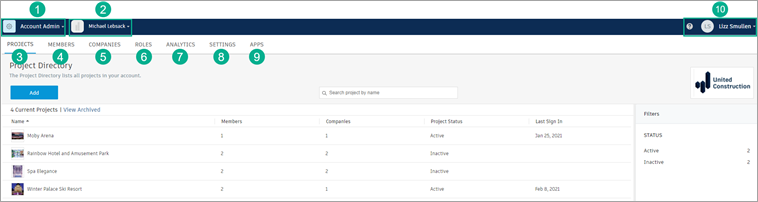 Account administrators are responsible for various workflows for managing the BIM 360 account, projects, and the members and companies involved. Refer to the topics linked below to see some of the basic administrative activities in action: