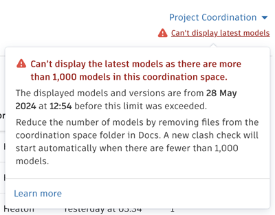 There are too many models in the coordination space | Coordination spaces with clash turned off can't display models corresponding to more than 5000 files. This limit refers to the total number files in the included folders. Only file types that are supported for aggregation in Model Coordination count toward the limit. Model Coordination will display the models corresponding to the first 5000 files from Document Management (by alphabetical order of file name). | Reduce the number of models in the coordination space by deleting or moving files out of the coordination space folder in Document Management, or creating multiple coordination spaces with fewer models in each. For example, create a coordination space for each building in a project, or for each level of a building, or phase of a project. |
