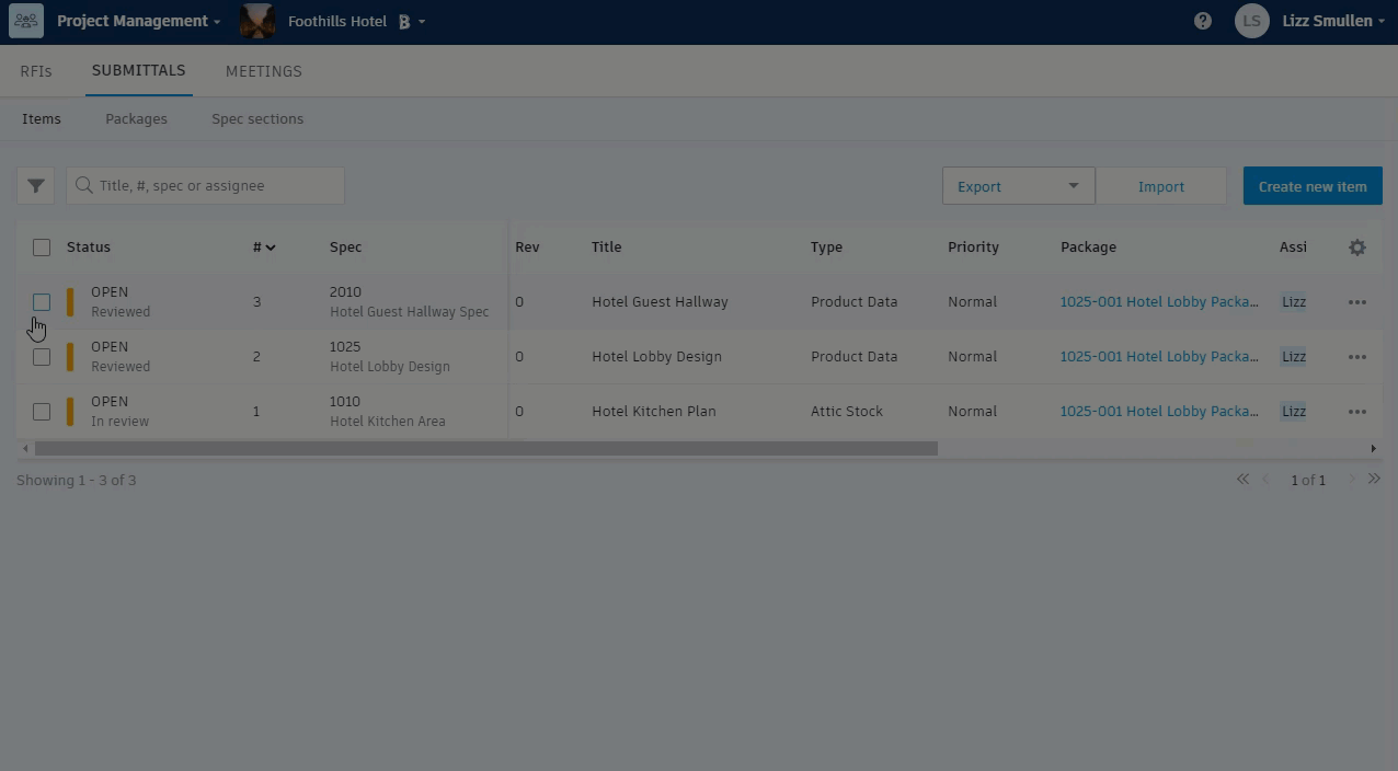 - Add to package: Allows you to select multiple submittal items and assign them to a single package.