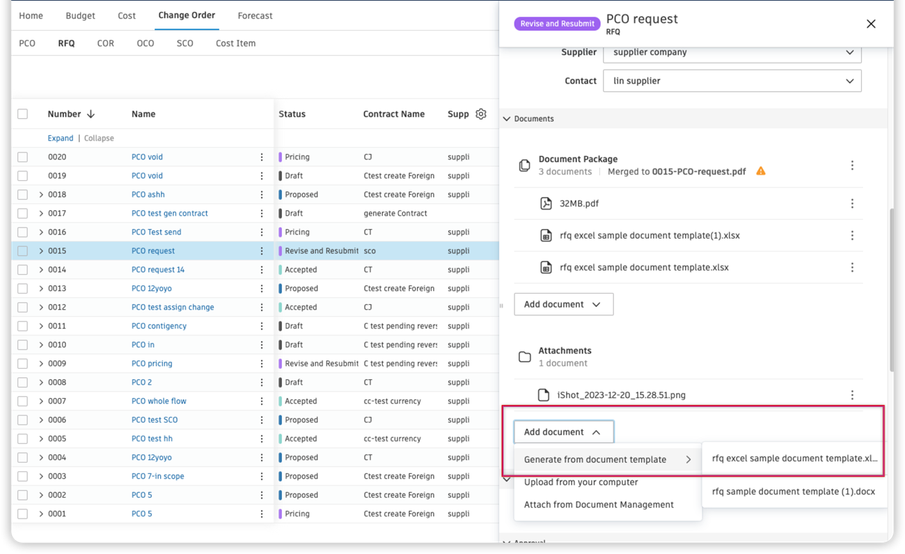 - Add from PCO: For any change order. Add documents from a potential change order, which is the starting point of the change order workflow.