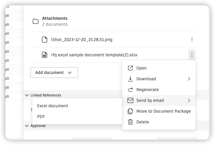 - Send by email for reviewing all associated scope and documentation. The document package will be sent as an attachment. If it exceeds 20MB, a download link will be provided instead.