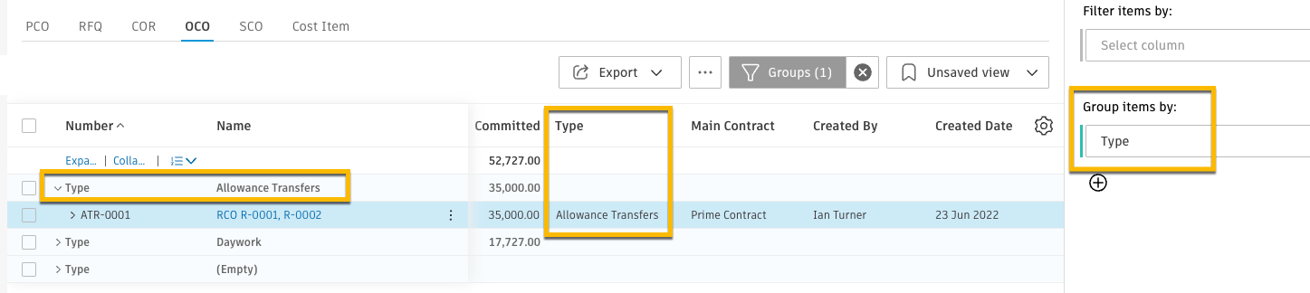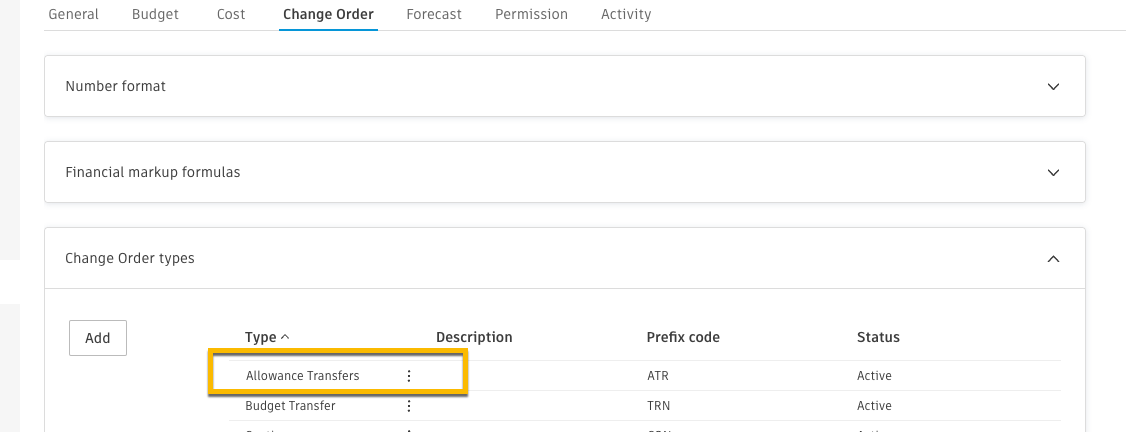 Scenario: You have created a change order type called “Allowance Transfers”.