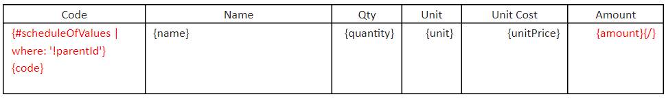 Scenario: You want to create a contract with only the subtotal of SOV subitems displayed. You don’t want a parent item to be visible to a subcontractor. To do that, use these variables from the document template: