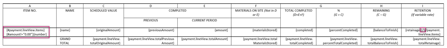 To eliminate subtotals from payment applications or contracts, you can enter your payment line items with {#children.length===0}{xxx}{/}