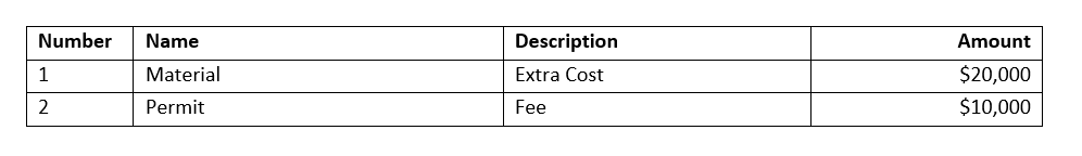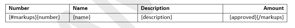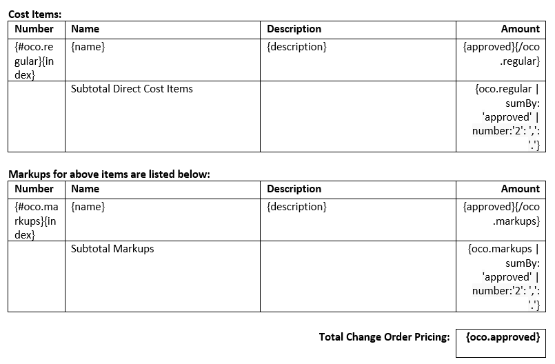 Scenario: You’re creating a change order document (for example, OCO) and want to have two separate tables within. One for regular cost items with a subtotal and the second for markup cost items. You want to add total change order pricing as well. How to do that? Here’s an example of used variables in a document: