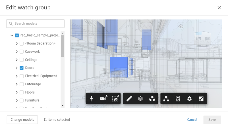 Use the dialog to select which models or documents you want to compare for changes in that watch group.