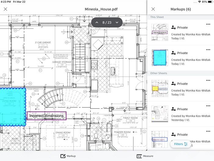 By default, markups are private. To make a markup visible to all project members, tap a small arrow next to Private markup and then tap Published markup.