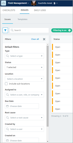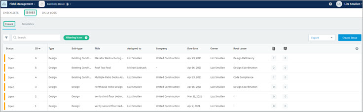 In Field Management, the Issues tab is where you can view, create, edit, filter, and comment on project issues.Learn how to control your issue email notifications.