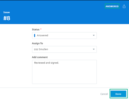 - Creators, assignees, and administrators can set an issue as Answered.
