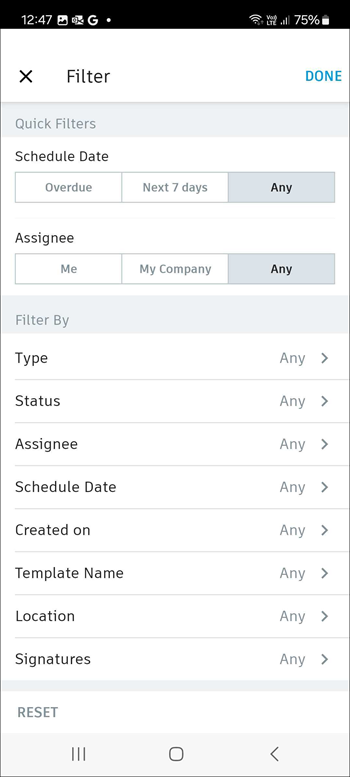 Filters: You can filter by type, templates, status, location or sublocation, assignee, schedule date, signature, or creation date, tap Filters