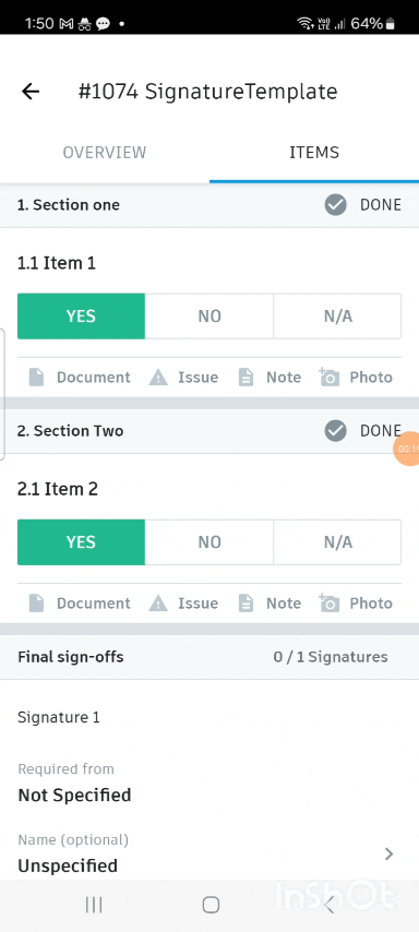 You may need to submit your signature to complete a checklist. In the Signature/Final sign-offs section, tap the Tap to sign box, and draw your signature. If needed, hand the device to the person whose signature is required.