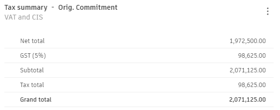 Using tax variables {#taxes} and {/taxes}, you can generate a list of the tax summary. For example, given the following tax summary in Cost Management:
