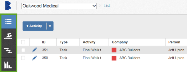 There are three different view types for viewing your activities; List, Swimlane, and Gantt. Each view highlights different information and can be useful in different situations.