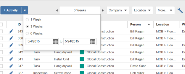 - To filter by activity type, work breakdown structure, or status, click More and make your selections.