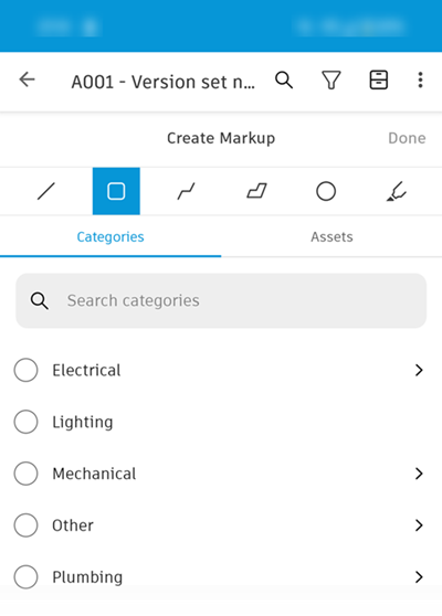 When assets are visible on a sheet in the mobile viewer, you can create asset markups as described in Create and Track Assets on Sheets.