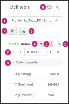 - Station properties: Displays the easting, northing, and elevation coordinates of the currently selected station.