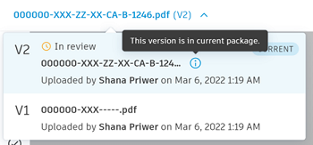Click the name of the file on the top left to view a list of the different versions. Hover the i icon to see the file version which is added to the package.