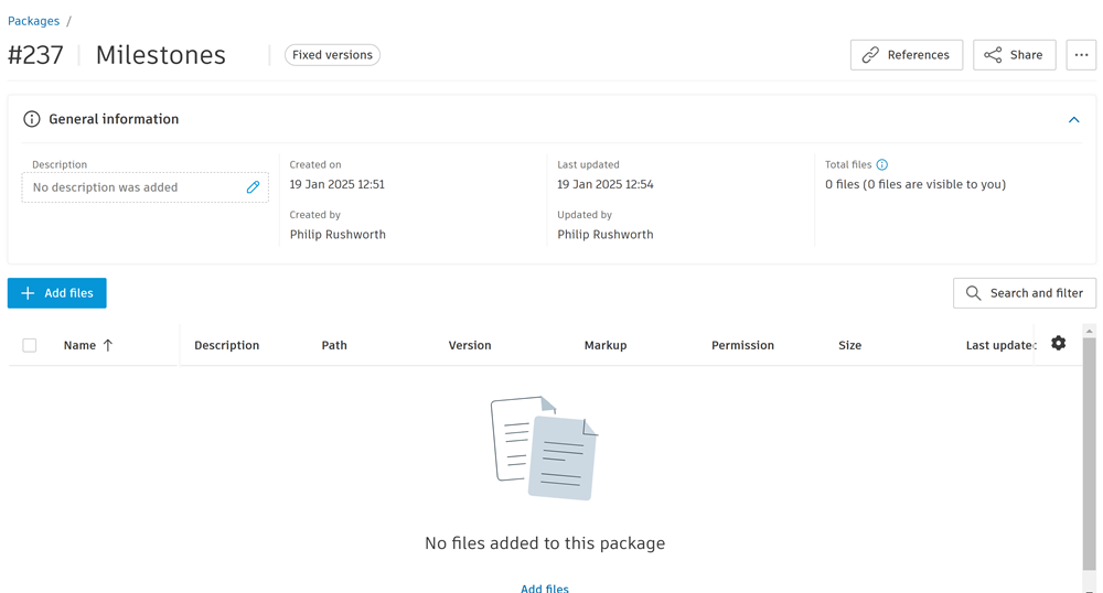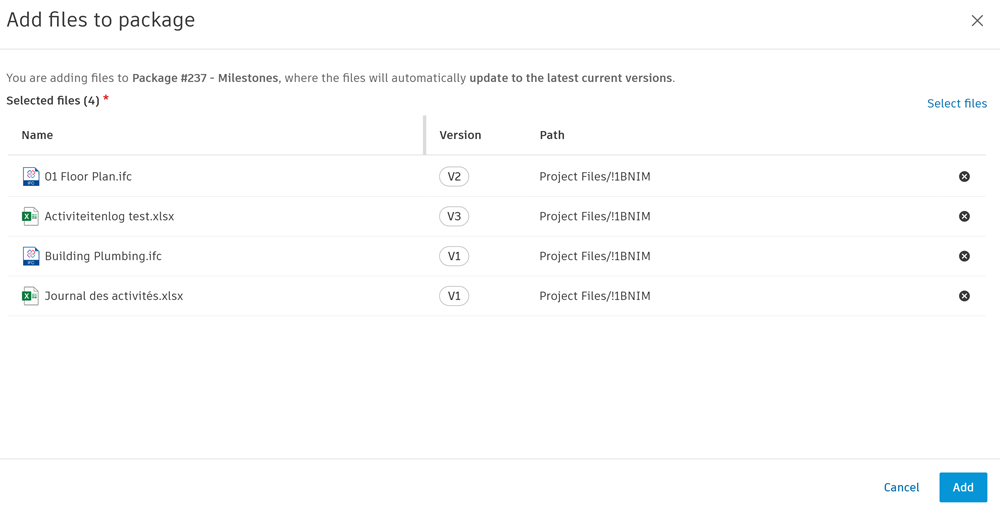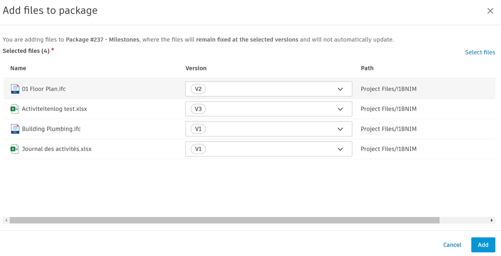 This opens the Add files to package dialog. There is a different workflow depending on whether you are adding files to a Current versions or Fixed versions package: