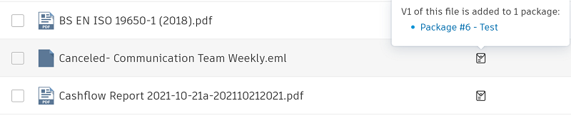 Hover the icon for details about which package the file is added to and access a link which opens the package.