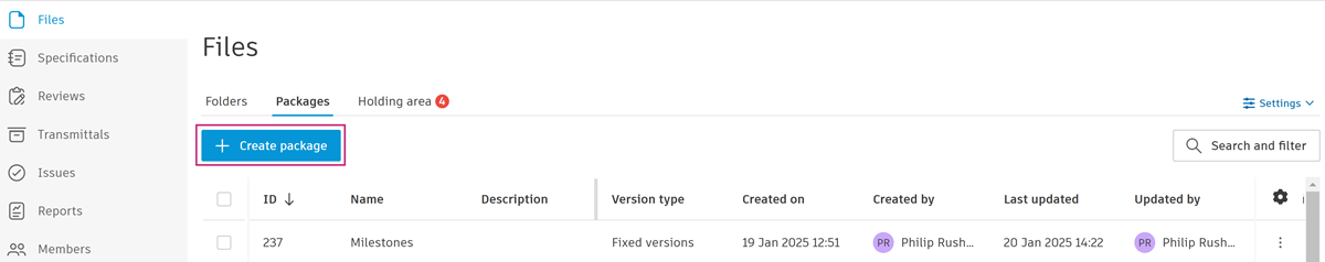 Project administrators and package managers can create packages and add files. Once a package is created on web, it will also be available to view on mobile.