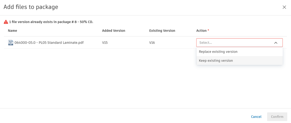 Note: If you've selected a different version of a file which already exists in the fixed versions package, you need to select which version you're keeping.
