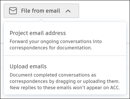 To store preexisting correspondence from your email client into the Correspondence tool, use File from email, and select the relevant option.