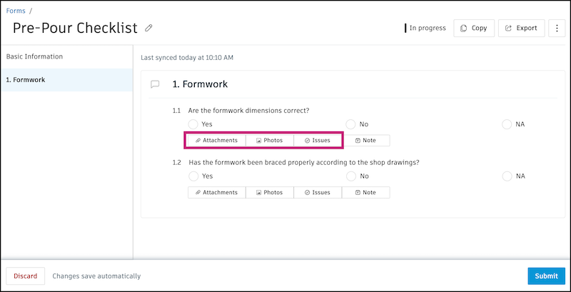 - The form and question level in the forms created in Autodesk Build and to the question level in forms created in Autodesk Build