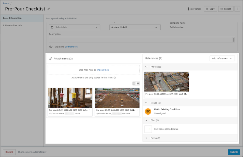 Form references allow you to add and connect ACC project items that are related to a form. References can also be files, photos, or videos. The following table can help you understand the key differences between attachments and references:
