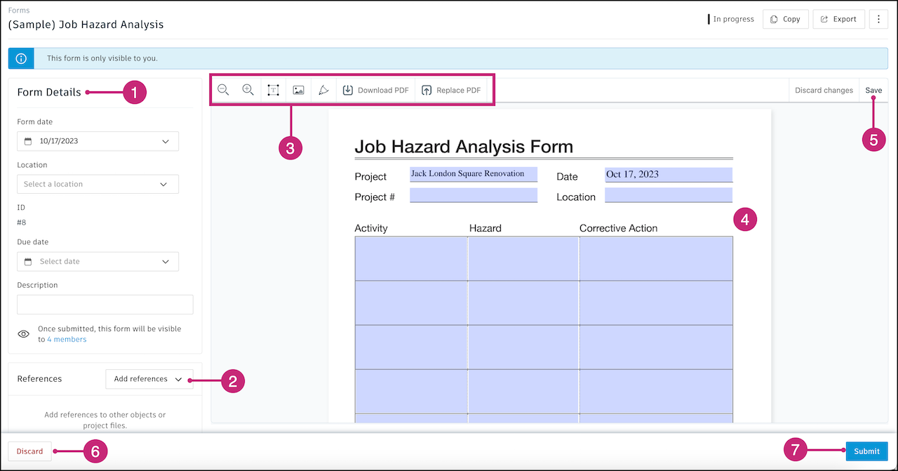 To delete an In Progress form, click Discard.