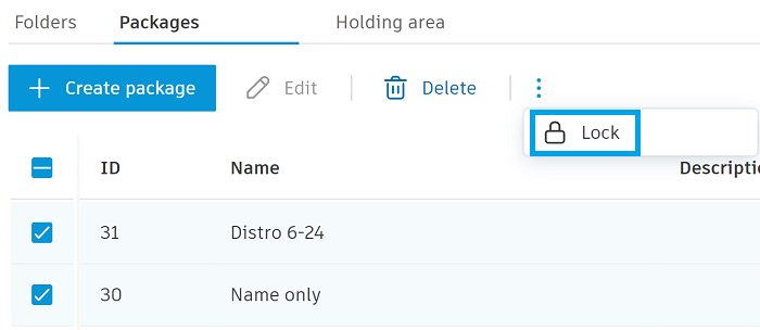 If you select multiple packages, either click Edit above the packages list or click the More menu for Delete and Lock options.