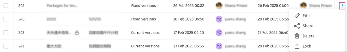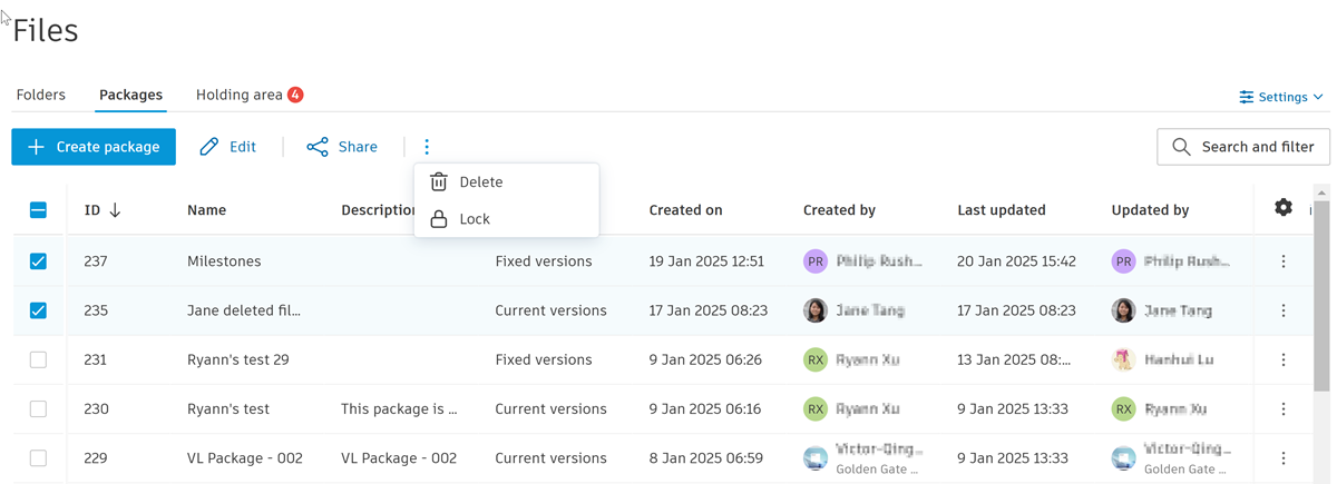 You can edit, share, delete, and lock one or more selected packages. For a single package, click the More menu to access these options.