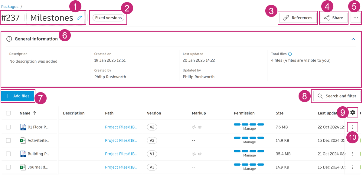 General information: This contains summary information including Total files. A package may contain more files than you can actually view. This is due to members requiring View folder permission or above for each file in the package. Total files details the actual number of files in a package and the number of files visible to you.