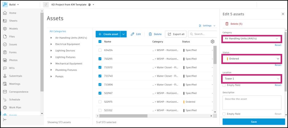 Select the Status, Category, and Location edits you would like to make to your chosen assets. Only members with full Manage permissions can delete.
