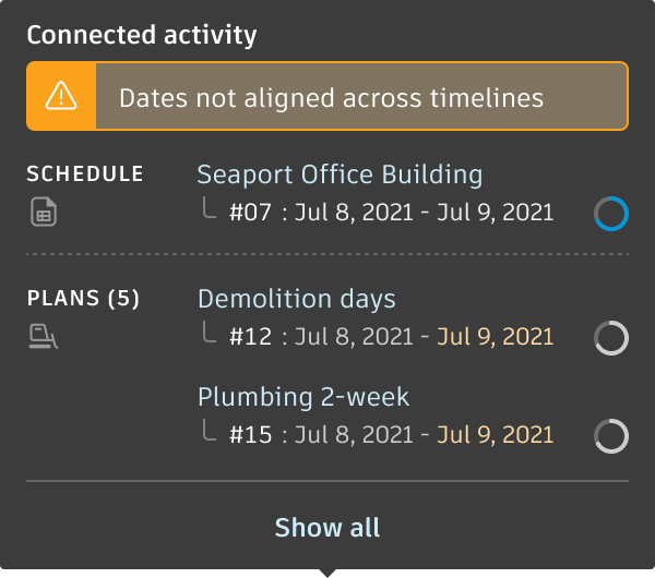 Date misalignments are indicated when a connected task has dates that differ from the linked schedule activity. The indications will appear as an alert in both the plan and in the schedule and also in the swimlane view as a misalignment of the range.