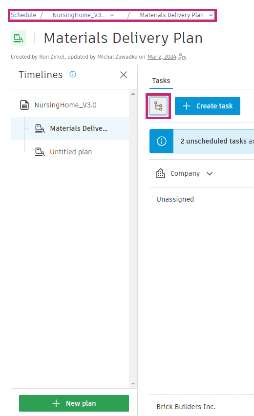 For plans connected to a schedule, tasks stay synchronized with schedule activities. A connected work plan allows linking tasks to activities to ensure coordination between planned tasks and scheduled execution.