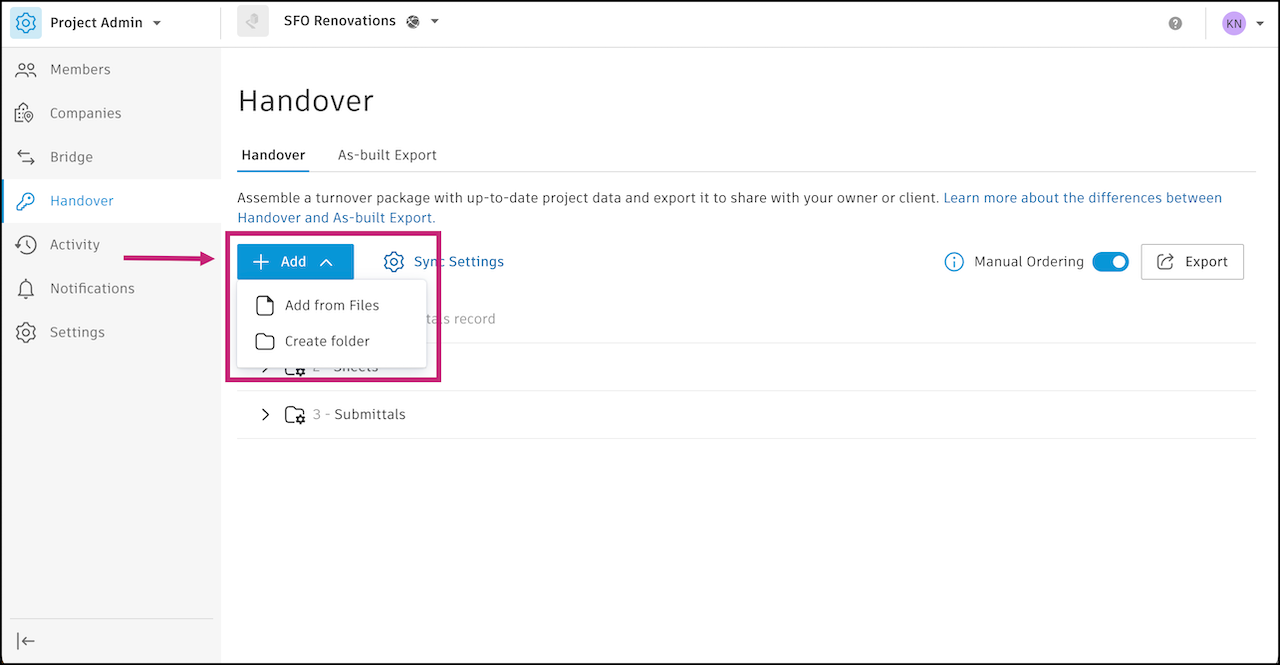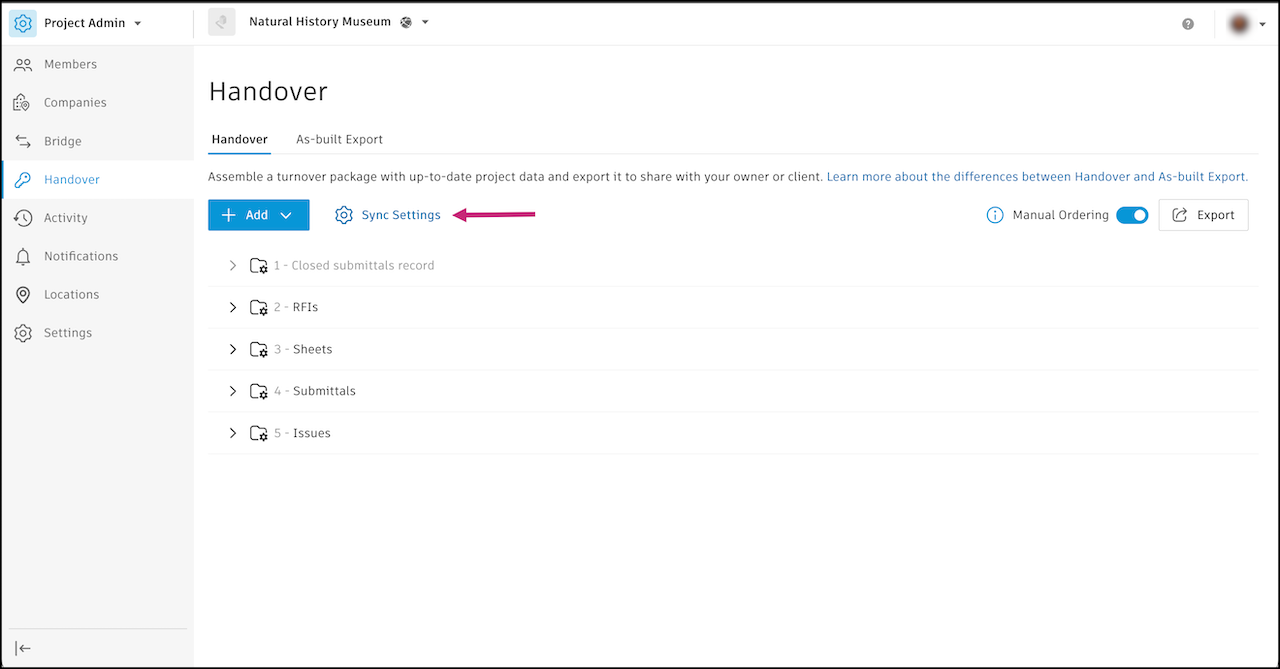 Submittals: Handover: This allows you to set the types of submittals that will be included in the Submittals folder. O&M Manuals and Warranty/Guarantee submittal types are automatically selected.