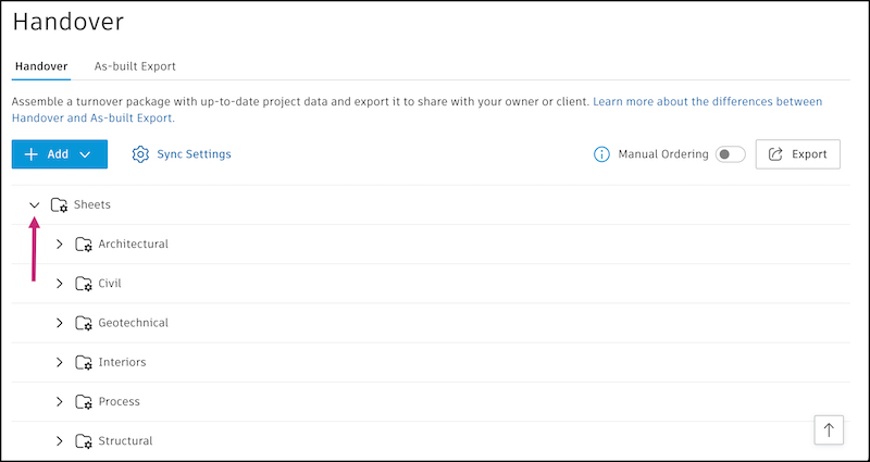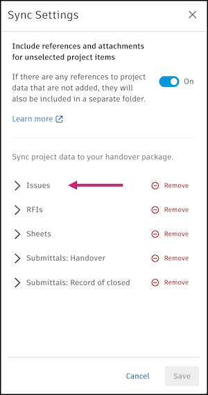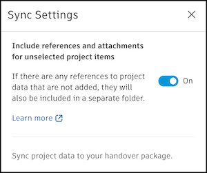 Optionally, at the top of the Sync Settings panel, you can click to toggle on Include references and attachments for unselected project items. This will include any supported references and attachments not added in Handover to the export.