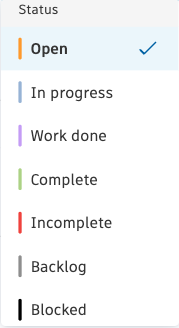 Status | Open, Backlog, In progress, Blocked, Complete, Incomplete | Open |