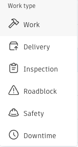 Work type | Work, Delivery, Inspection, Roadblock, Safety, Downtime | Work |